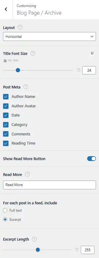 - Title Font Size: Adjust the font size for post titles in archives using the slider or number input.