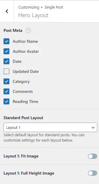 - Standard Post Layout: Use this dropdown to select the default hero layout for regular posts (for example, “Layout 1”).