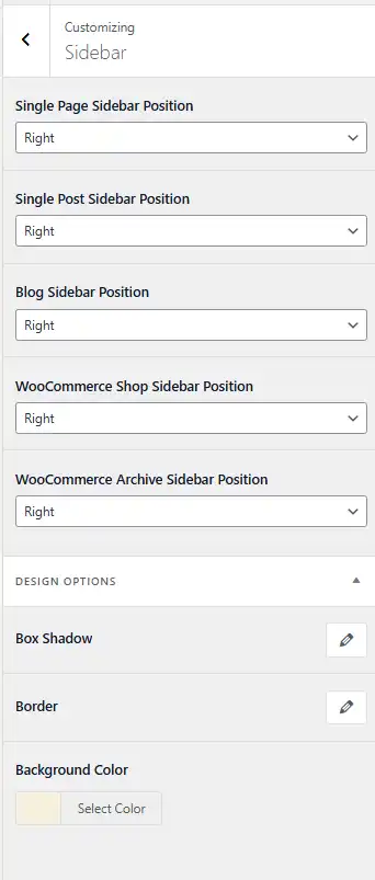 In Appearance → Customize → Sidebar, the Design Options section lets you style the appearance of the sidebar container: