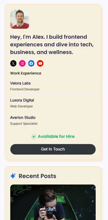 - Background Color – Sets the background color for the sidebar area; using a light accent color helps widgets (like the author card and Recent Posts) stand out, as shown in the example frontend screenshot.