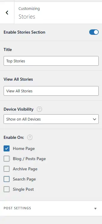 From here you can enable the section, choose where it appears, define which categories to show, and control what appears inside each story card.